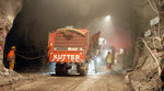 Großfräsen-Einsatz jenseits der Straße: Abtrag des gesprengten Gesteins in einem Tunnel. Hier entsteht eine Zufahrt zum Pumpspeicherwerk. Foto: Kutter GmbH & Co. KG |