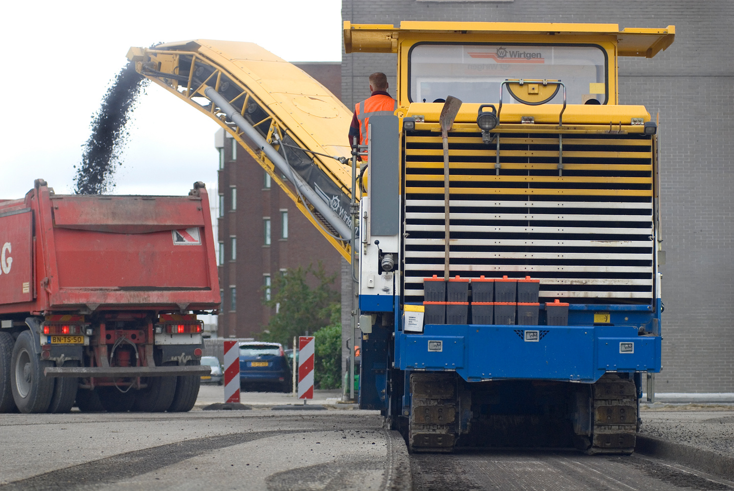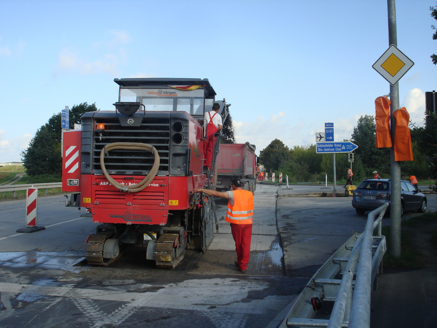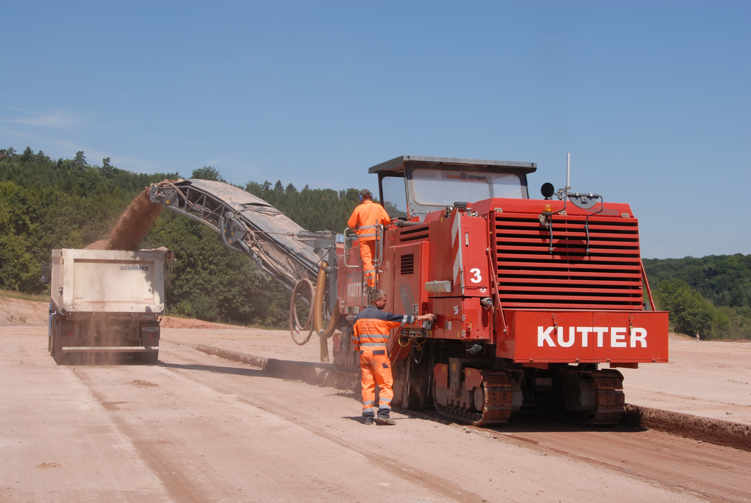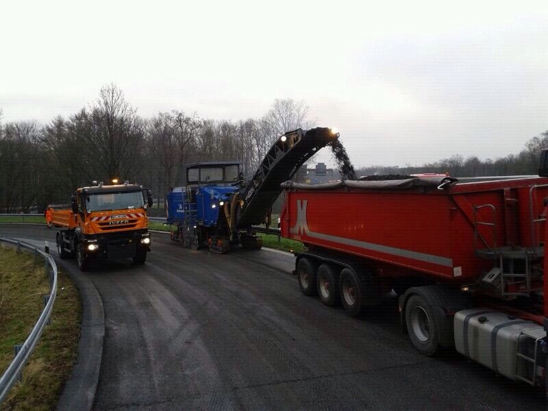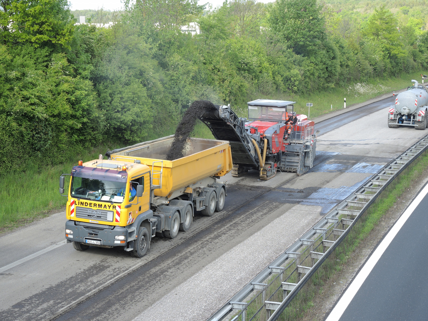 Großfräse beim lagenweisen Abtrag der Fahrbahndecke auf einer Autobahn.