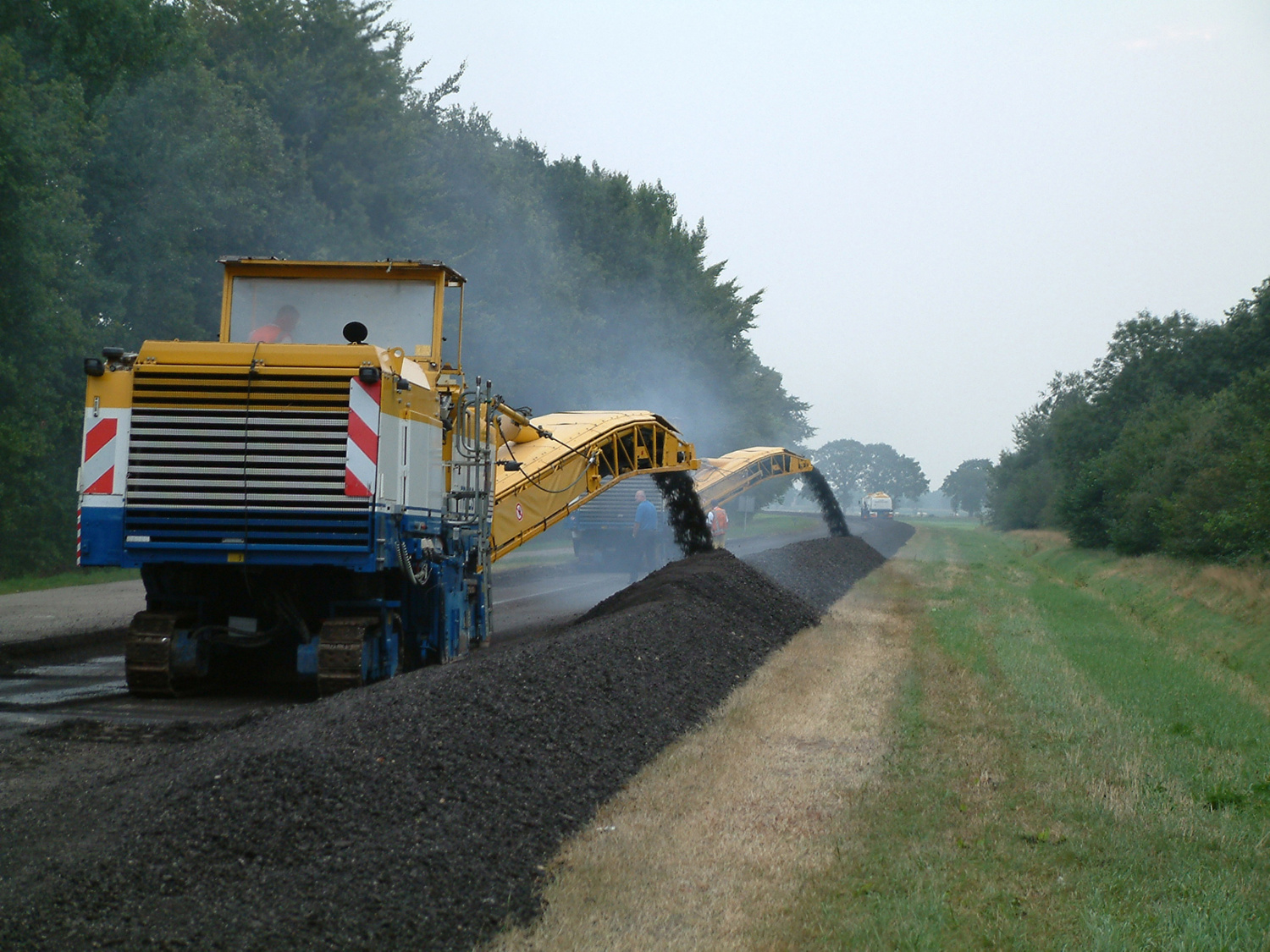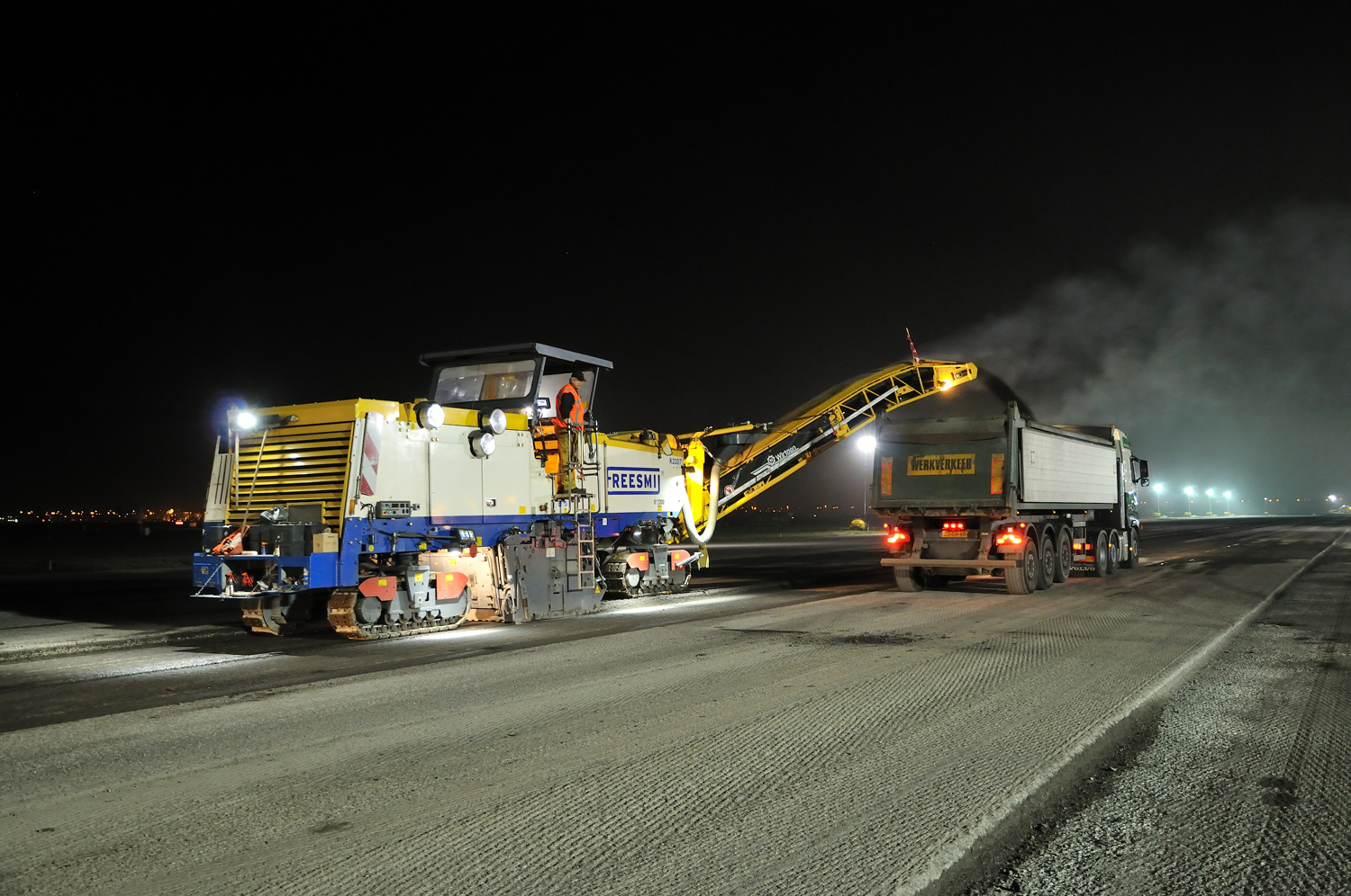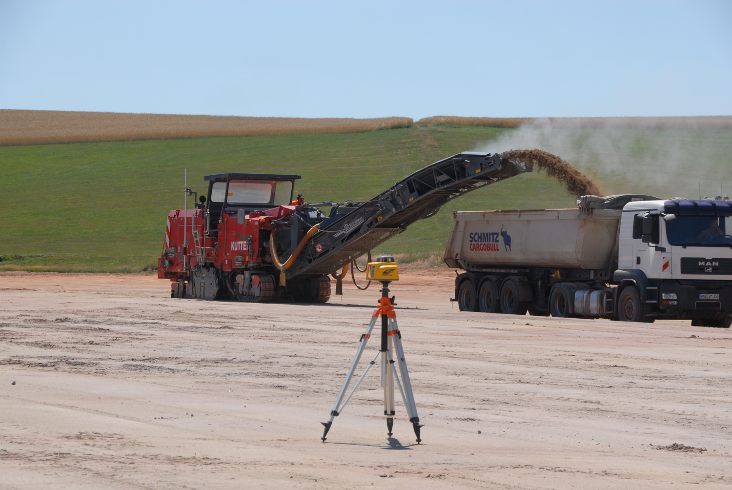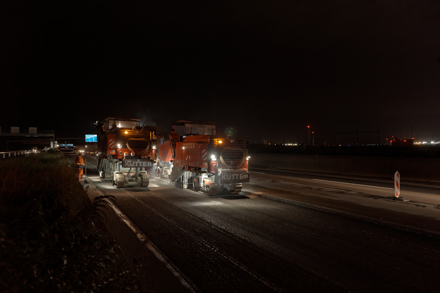Großfräse beim lagenweisen Abtrag der Fahrbahndecke auf einer Autobahn.