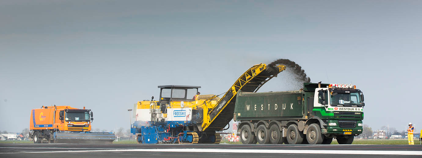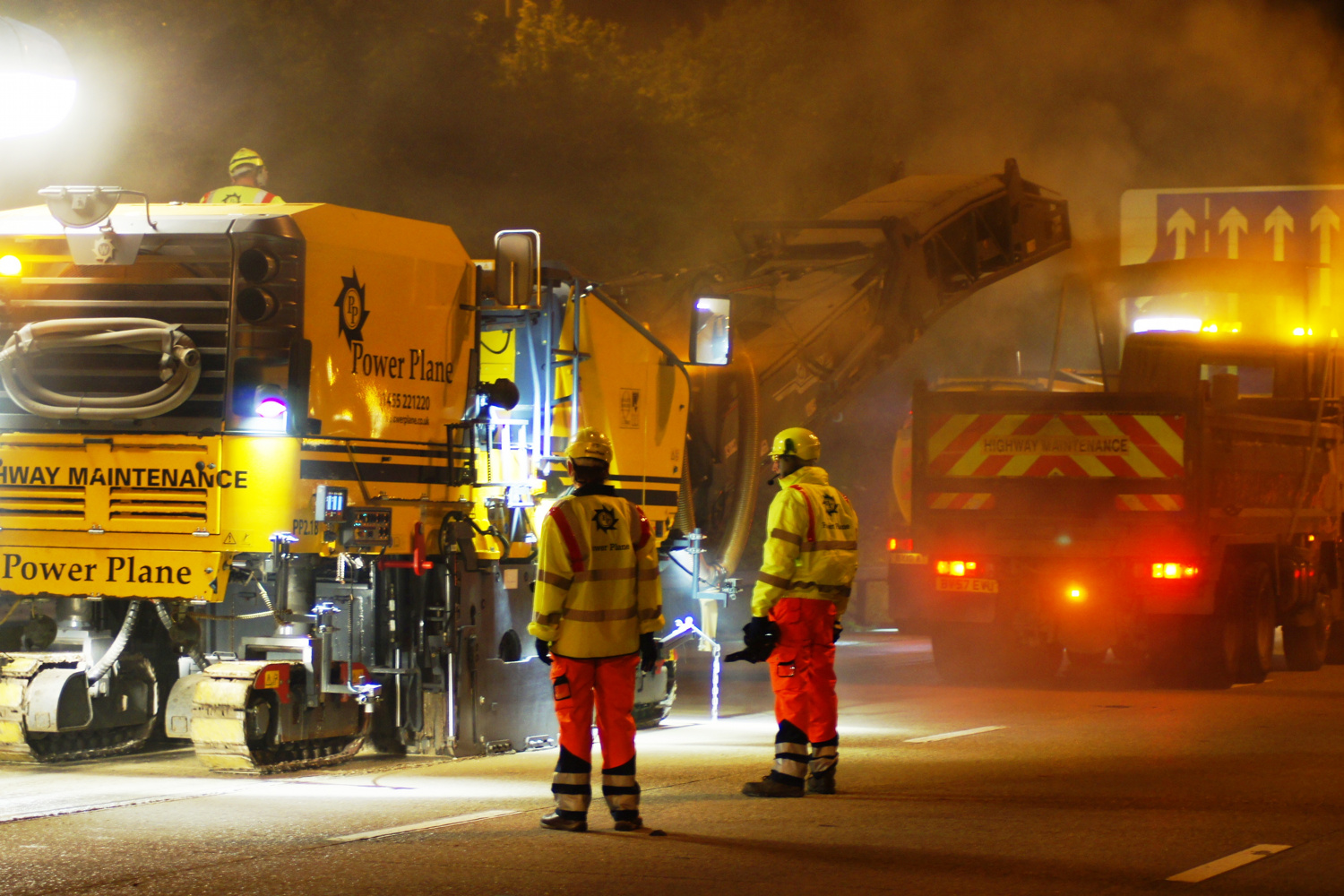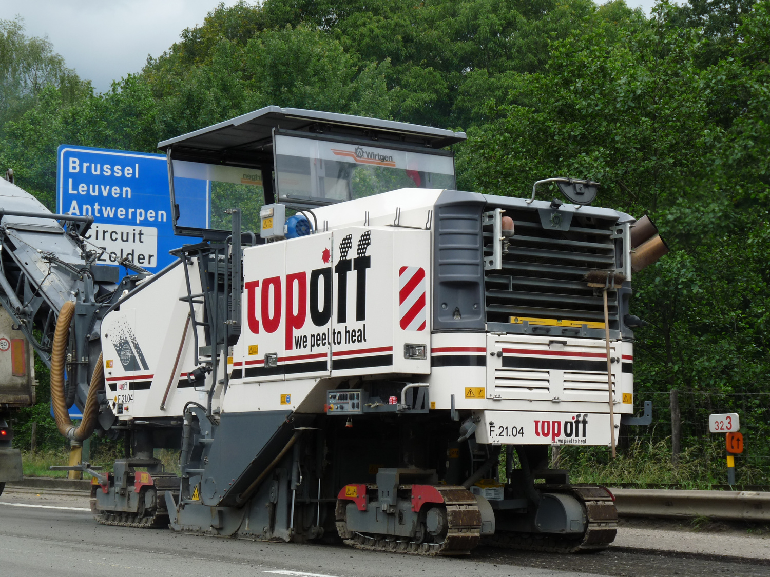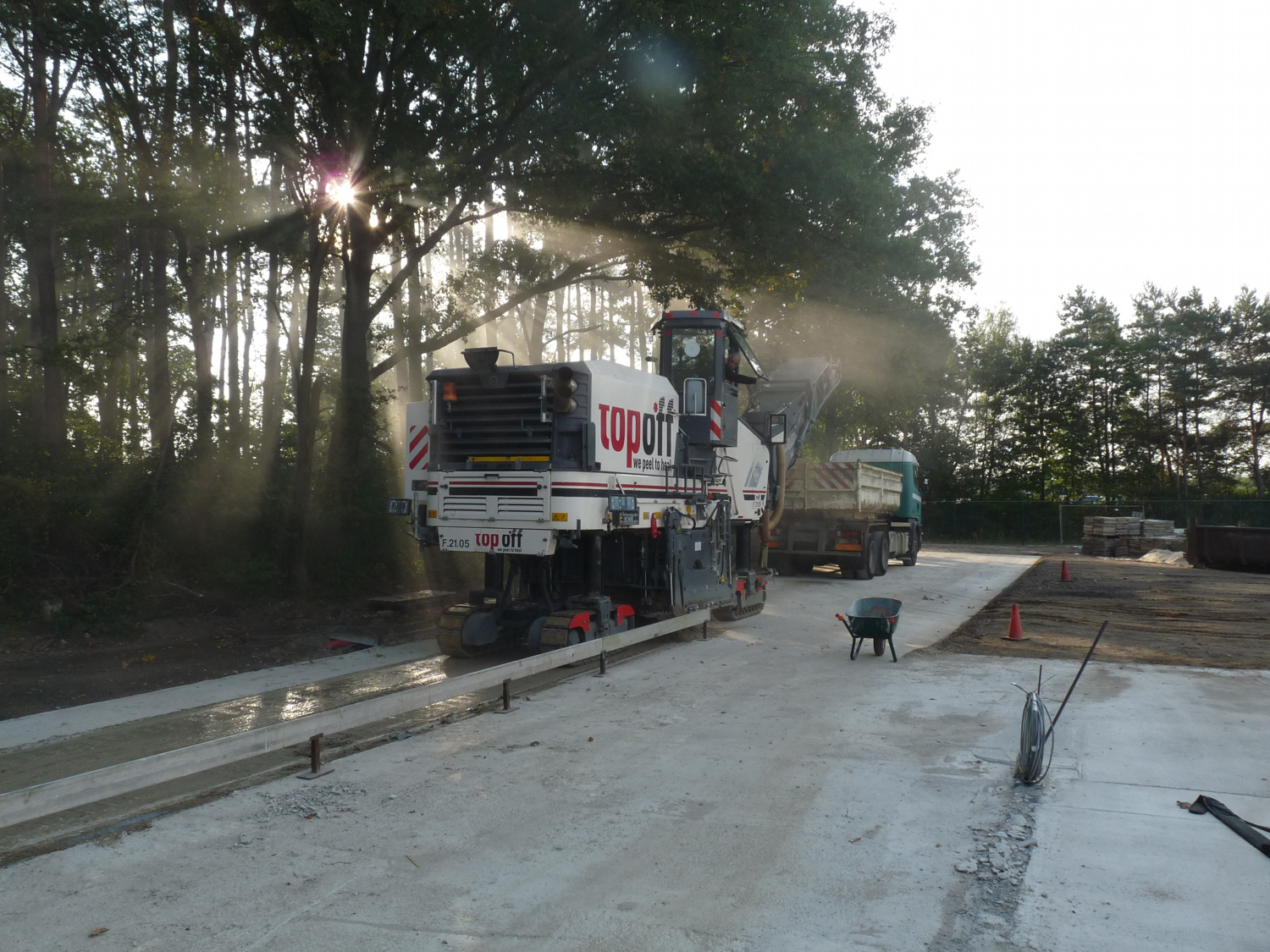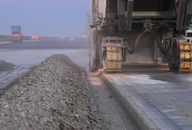 Großfräse beim lagenweisen Abtrag der Fahrbahndecke auf einer Autobahn.