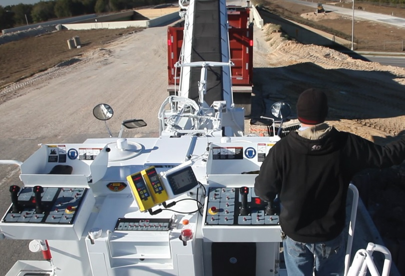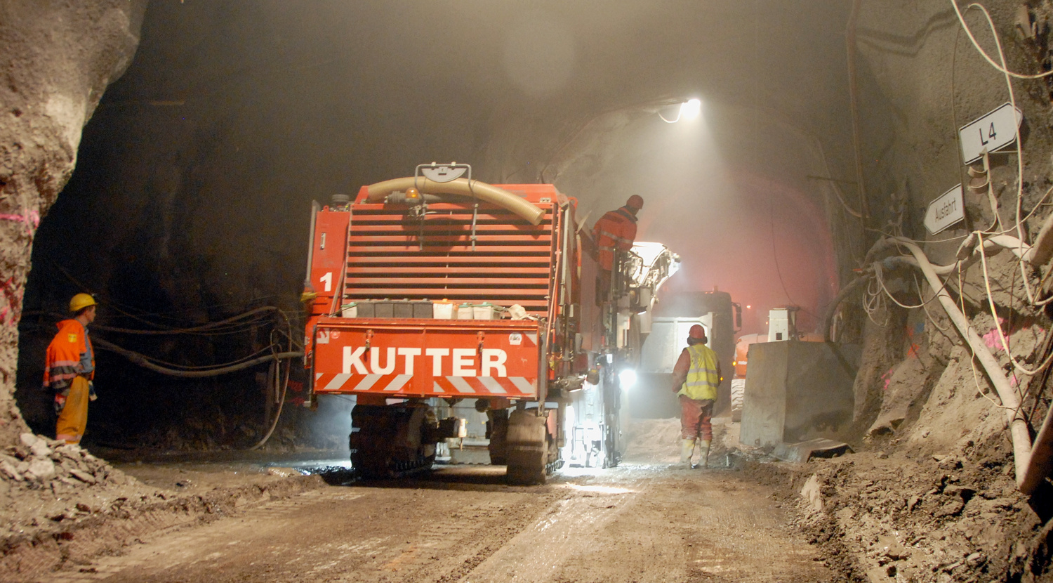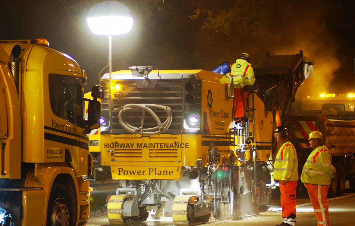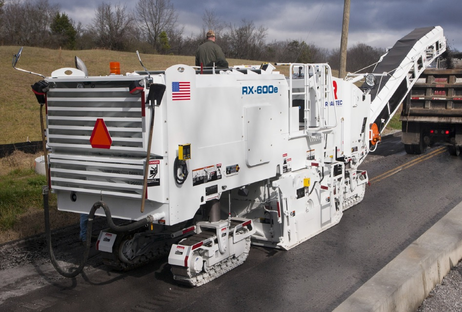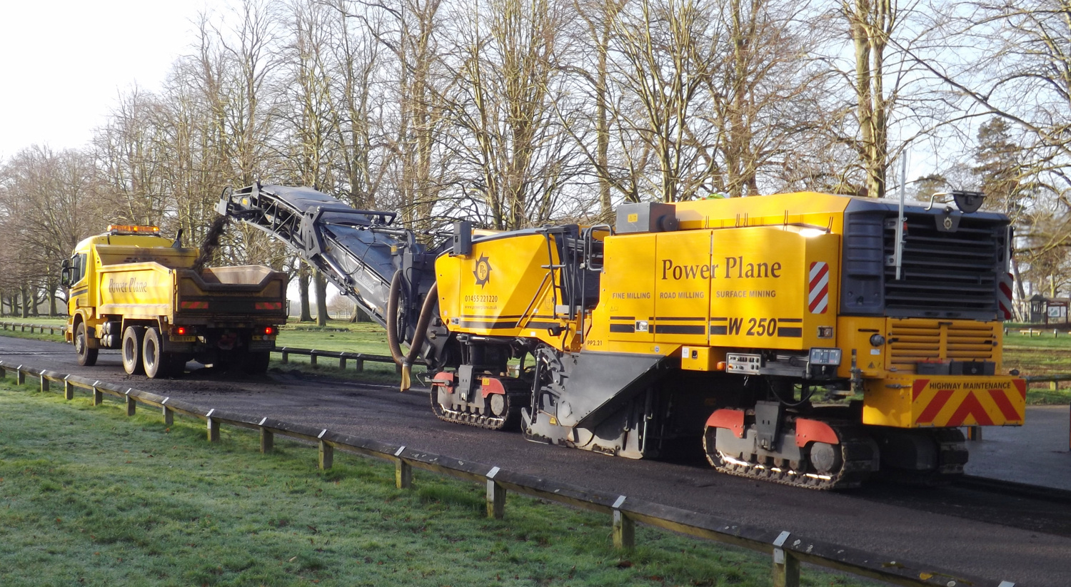 Großfräse beim lagenweisen Abtrag der Fahrbahndecke auf einer Autobahn.