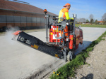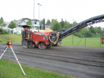 Abtrag der Deckschicht auf einem Parkplatz. Die Ebenheit wird über einen Rotationslaser (auf dem Rasen) und dem entsprechenden Sensor an der Maschine sichergestellt. Foto: Kutter GmbH & Co. KG |