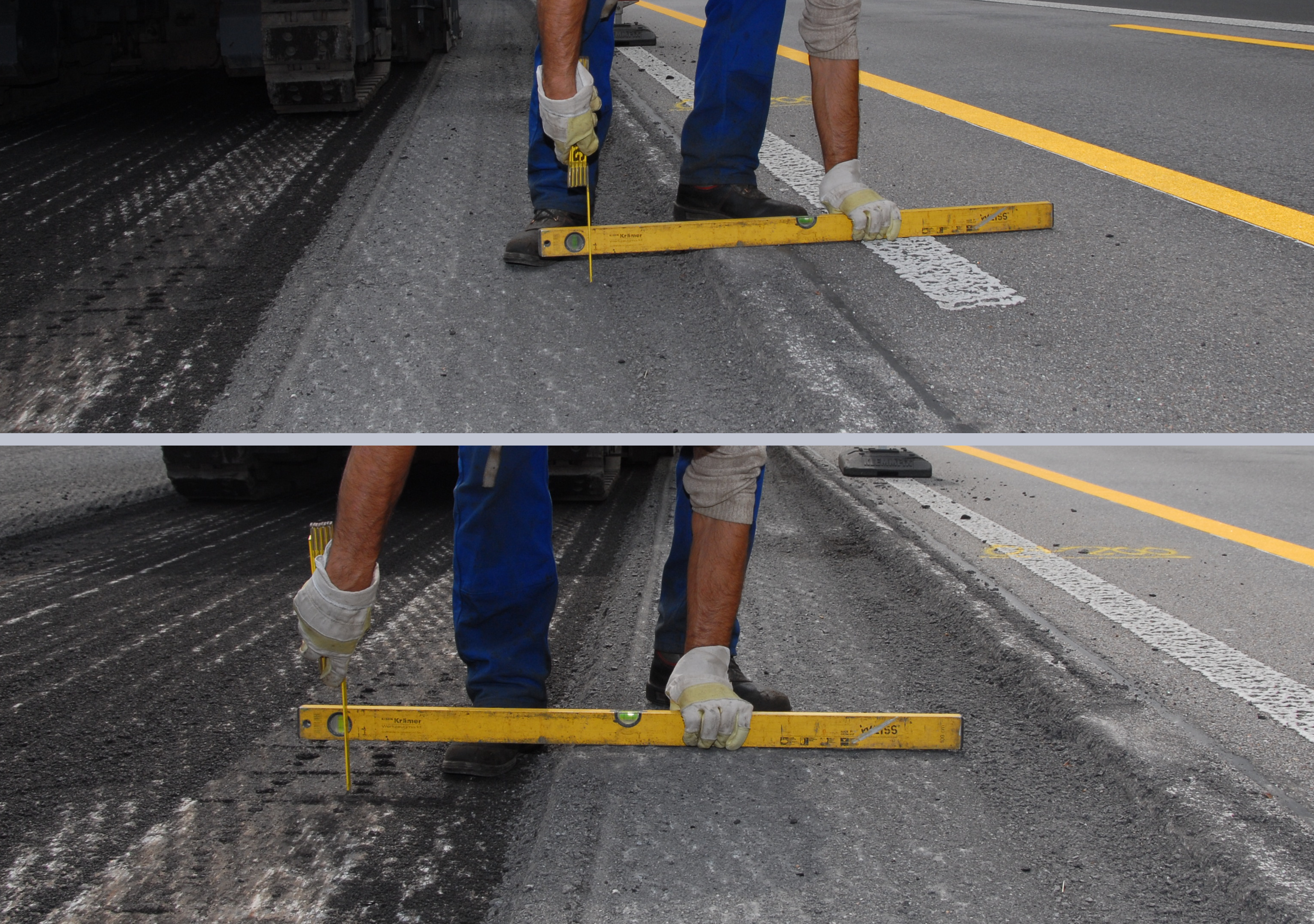 Modern cold milling machines can do this with the aid of automatic levelling. Usually, the thickness of the layer to be removed, the milling depth, is determined roughly in the tender and in detail on site. To ensure that the milling machine removes the pavement to exactly the required thickness, mechanical or optical sensors on the cold milling machines scan a reference plane, also known as the reference surface. The automatic system then ensures that the milling depth is maintained. Which sensor technology and which sensor arrangement is suitable depends on the conditions on site. In any case, the necessary equipment is available at Europe's milling service providers.